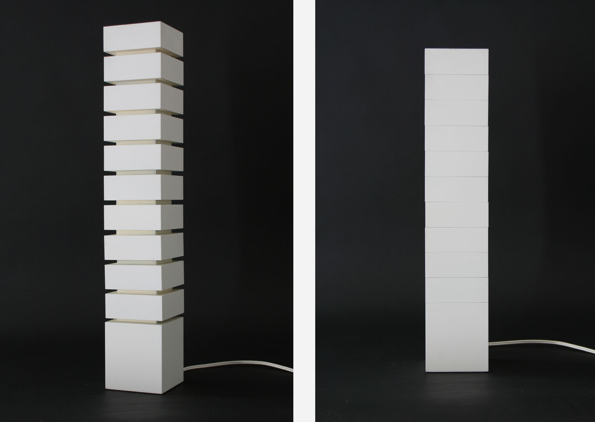 Von 1968, aus der fruchtbaren Pariser Zeit, stammt der Entwurf für die 1978, also erst zehn Jahre später, aufgelegte kleine Edition des kinetischen Turmes. Ganz nach dem Erb‘schen Prinzip gestaltet sich dieses Objekt aus weiß lackierten Aluminiumschienen als Archetyp seines gesamten Schaffens. Geschlossen zeigt sich die Steele mit quadratischem Grundriss schlicht und ergreifend. Schließlich setzt eine innenliegende Motorik das künstlerische Prinzip kontemplativer Bewegung in Gang. Behutsam öffnet sich Linie für Linie, es greift der Turm mit jedem erklommenen Stockwerk weiter in den skulpturalen Raum herein, entwickelt sich „von der Fläche zur Form“ und wirft seine Schatten, am Objekt selbst und auf seine rezeptive Umwelt. Seine komplette Höhe erreicht, wiederholt sich der meditative Vorgang en retour.