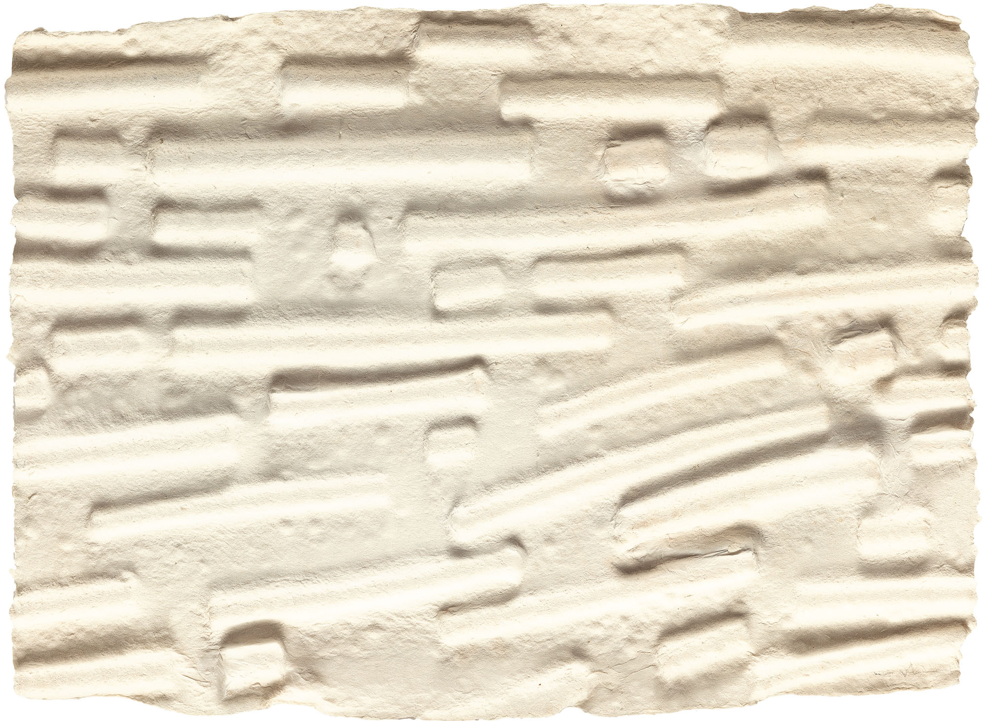 Der Träger ist ein festes, strukturiertes Pappmaché, welches als Material an sich bereits durch seine dreidimensionale, leicht wellige und strukturierte Beschaffenheit besondere haptische Qualitäten aufweist. Frei schwebend in einer schlichten Künstlerleiste gerahmt, wird die Plastizität bzw. Dreidimensionalität des Werkes zusätzlich betont.