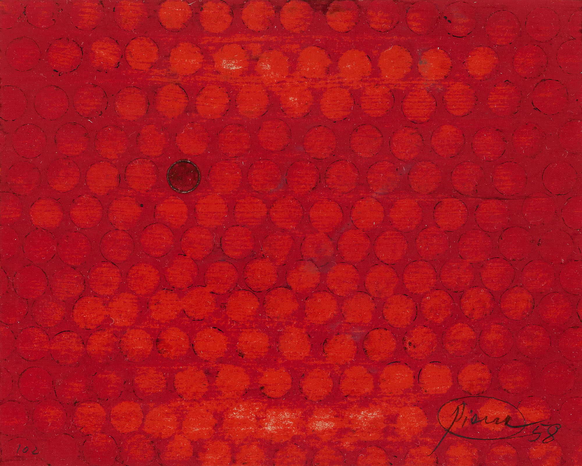 Charismatisches Werk von musealer Qualität. Mit seiner Datierung von 1958 eine jener seltenen, frühen Rasterarbeiten, die die darauf folgenden Rauchzeichnungen der 60er Jahre vorwegnehmen. Die Komposition mit orange-roten Punkten auf rot gestaltetem Papier ist von den frühen Rasterbildern inspiriert, die der Künstler ab 1957 fertigte. Bildfüllend platzierte, vermutlich gestempelte Punktreihen – Piene spricht von den einzelnen Punkten als „Points“ oder „Einzelkräften“ – dynamisieren das kleinformatige, monochrom rote Farbfeld, und die Vielzahl der Einzelkräfte führt im Ergebnis zu einer optischen Schwingung und filigranen Vibration.